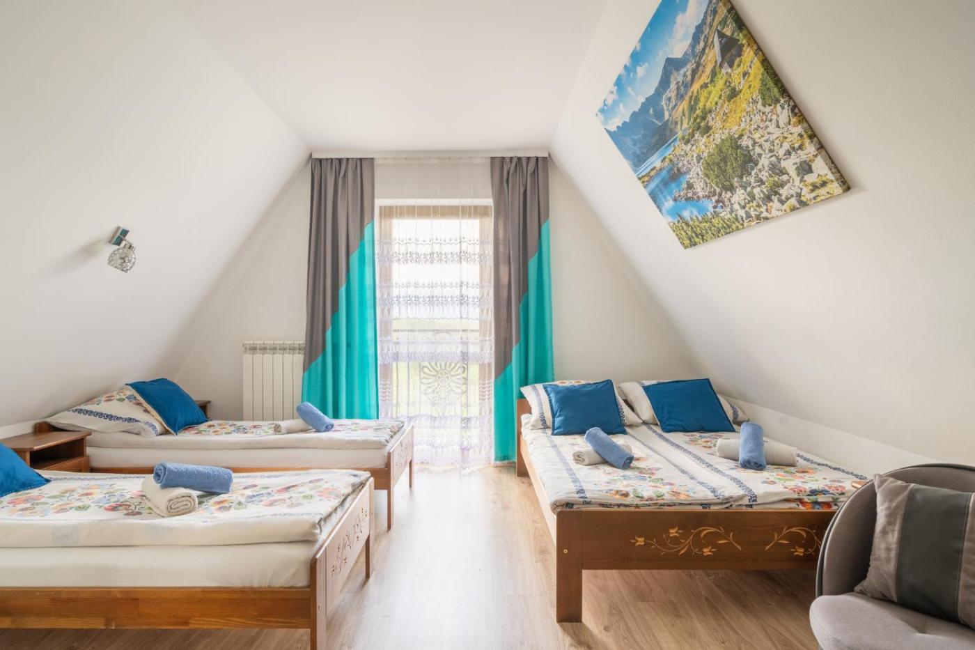 Pokój czteroosobowy z widokiem na góry. The quadruple room provides soundproof walls, a seating area, a balcony with garden views as well as a private bathroom featuring a walk-in shower. The unit offers 3 beds. Pokój Czteroosobowy - 4 osobowy. Powierzchnia pokoju ok.: 28 mkw. ;